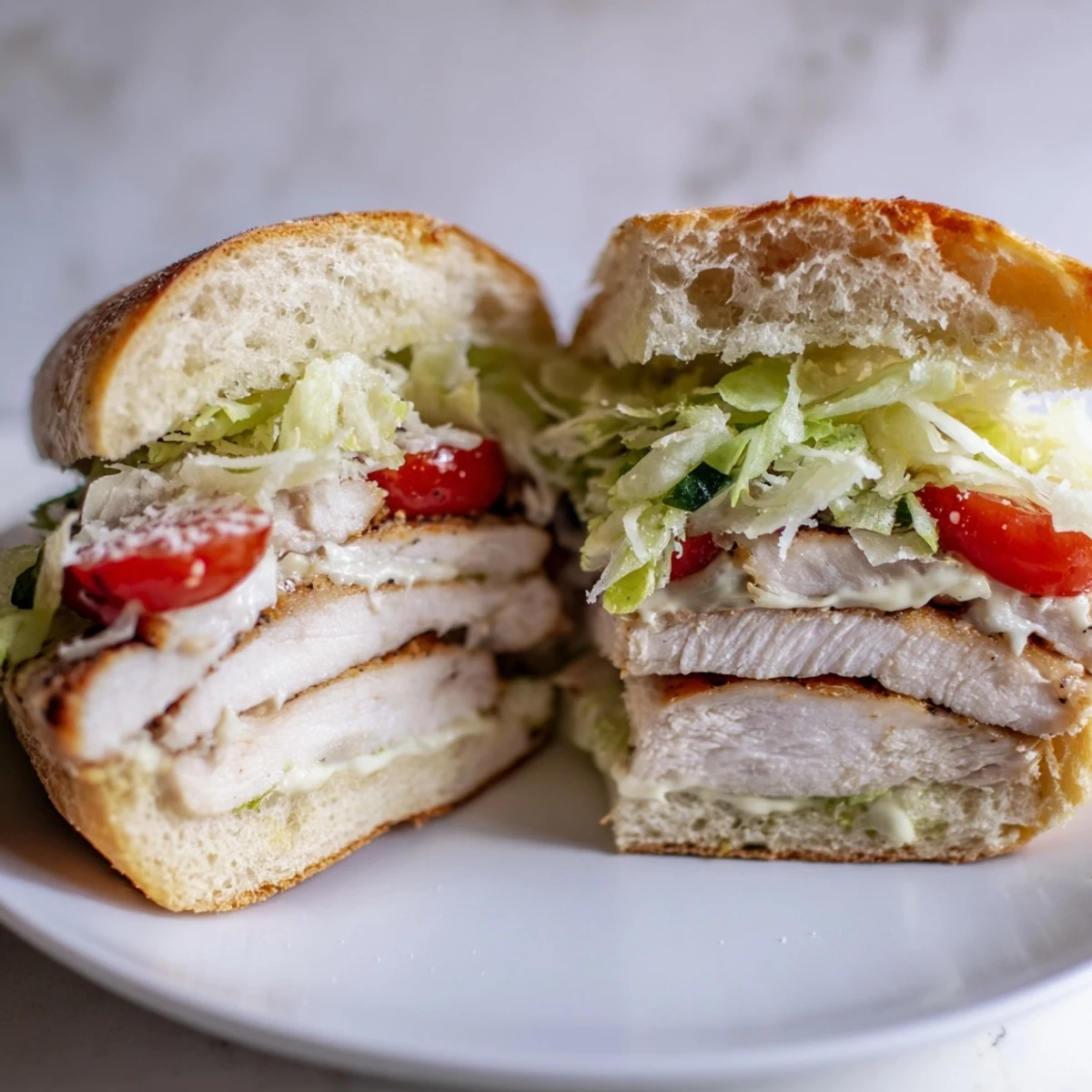 This satisfying handheld combines tender grilled chicken breasts seasoned with garlic and pepper, crisp shredded romaine lettuce, and a rich homemade Caesar dressing featuring mayonnaise, Parmesan, lemon, and Dijon. Served on butter-toasted ciabatta rolls with extra shaved Parmesan, these substantial sandwiches deliver all the classic Caesar flavors in portable form. The entire dish comes together in just 30 minutes, making it perfect for quick lunches or casual dinners.