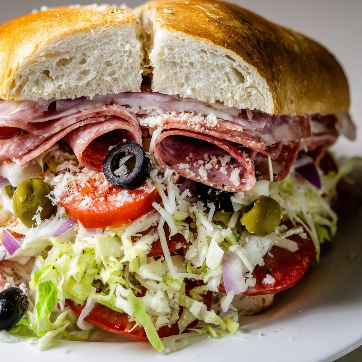 - Mound the dressed salad onto the meat and cheese, add extra pepper and Parmesan if you like, and press the top roll gently before cutting.