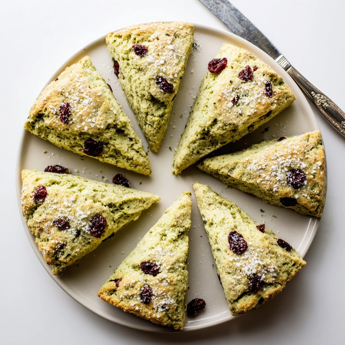 These tender scones combine earthy matcha green tea powder with tart dried cranberries for a delightful twist on a classic British treat. The buttery dough comes together quickly and bakes into golden wedges with lightly crisp edges and soft, flaky centers.