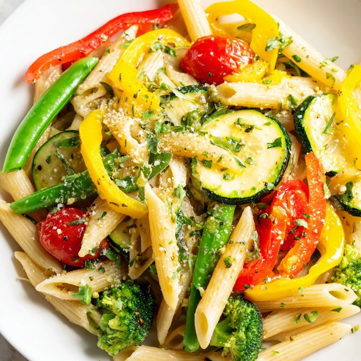 This Italian-inspired pasta dish celebrates spring vegetables at their peak. Al dente penne or spaghetti joins tender zucchini, yellow squash, bell peppers, broccoli, cherry tomatoes, and sugar snap peas in a fragrant garlic and olive oil sauce brightened with fresh lemon juice.