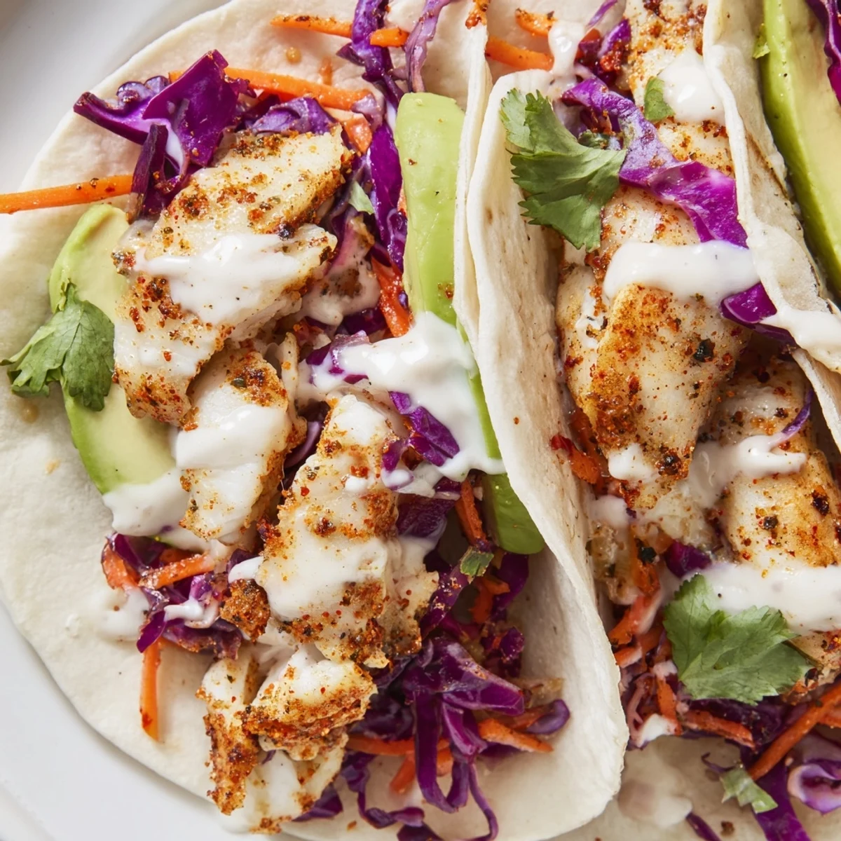 - Layer slaw and flaked fish onto warm tortillas, drizzle generously with crema, and top with avocado, cilantro, and lime wedges